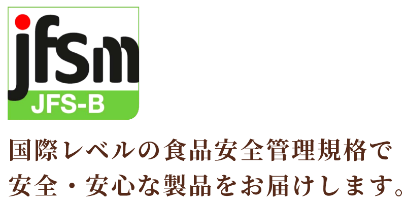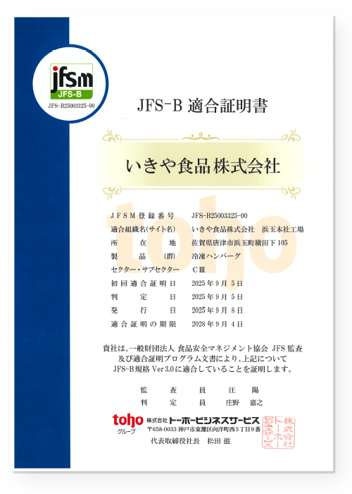 いきや食品は2025年9月に一般財団法人食品マネジメント協会(JFSM)が運営する食品安全規格「JFS-B規格」の適合証明を取得いたしました。JFS‐B規格は、食品安全マネジメントシステム(FSM)、ハザード制御(HACCP)、適正製造規範(Good Manufacturing Practice=GMP)の3つの要求事項層で構成された、国際整合性のある日本発の国際レベルの食品安全管理規格です。今後もお客様に安全・安心な製品をお届けできますよう維持継続し、さらなる品質管理体制の強化に努めてまいります。